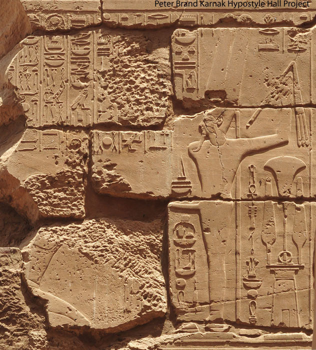 Scène 207 : Sethy 1er est agenouillé devant Amon-Rê et prononce une litanie qui est une liste d'offrandes. Le roi invoque Amon et l'Oeil d'Horus avant d'annoncer les offrandes : vin, eau, 4 sortes de pain, des gâteaux, miel, oignons, etc...