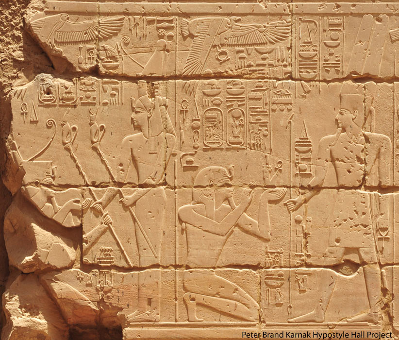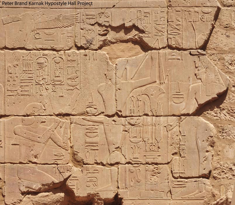 Scène 215 (droite) :  Sethy 1er agenouillé  offre un bouquet de fleurs  à Amon-Rê Kamoutef représenté ithyphallique et suivi d'Isis. Derrière le roi, le Ka royal porte le nom d(Horus du roi. Amon lui donne toute vie, stabilité, pouvoir et toute santé. Derrière Amon, la formule de protection inscrite dans de nombreuses scènes. Nekhbet vole au-dessus de la scène.