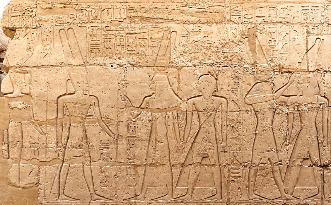 Scène 106 à gauche : Hathor amène le roi vers Amon et Amonet. Hathor porte les grandes plumes et joue du sistre. Le vautour Nekhbet vole au dessus de la scène. Hathor présente le roi à Amon qui lui donne notamment sa propre durée de vie en tant que roi. Amonet lui promet des millions de jubilés.