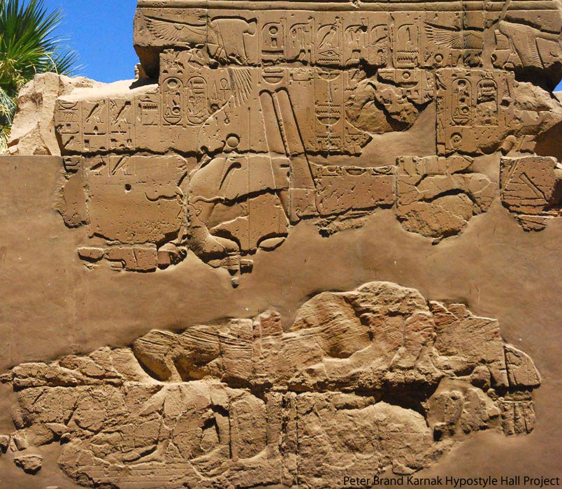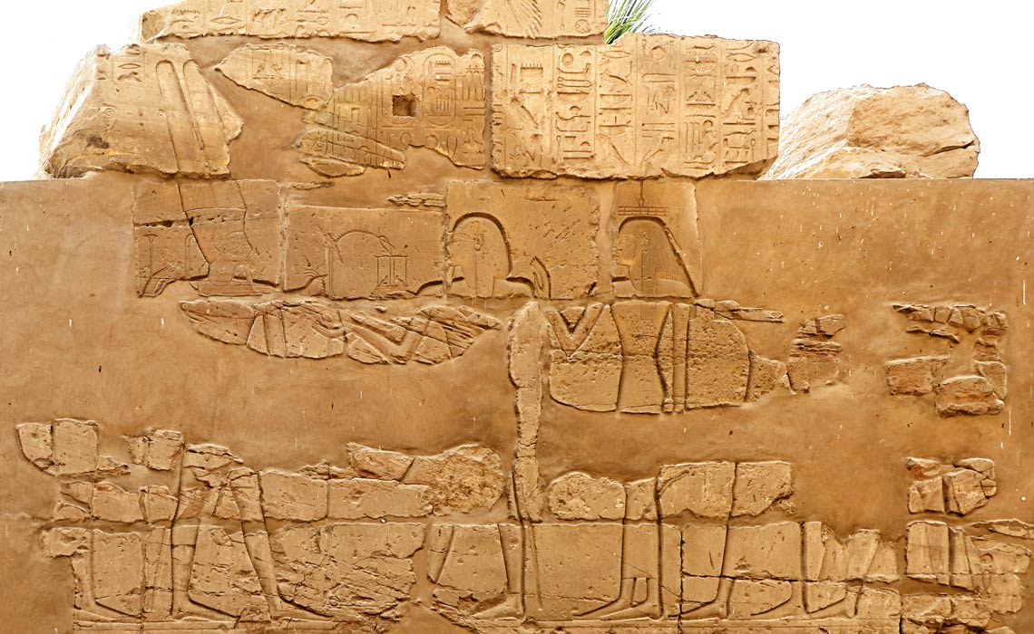 Scène 107 à gauche : le roi encense et verse une libation devant un kiosque dans lequel Amon-Rê est embrassée par Mout. Amon est le premier dans Karnak et roi des dieux.