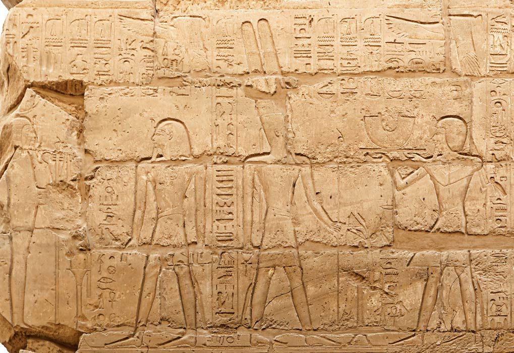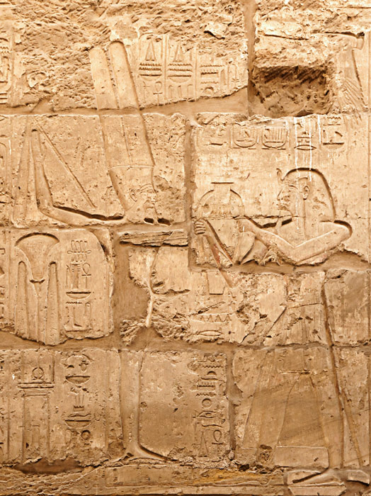 Scène 98 : le roi offre un collier pectoral à Amon-Rê Kamoutef ithyphallique. Derrière le dieu, la formule de protection et de bienfaits. Le dieu donne aussi au roi toute vie et pouvoir.