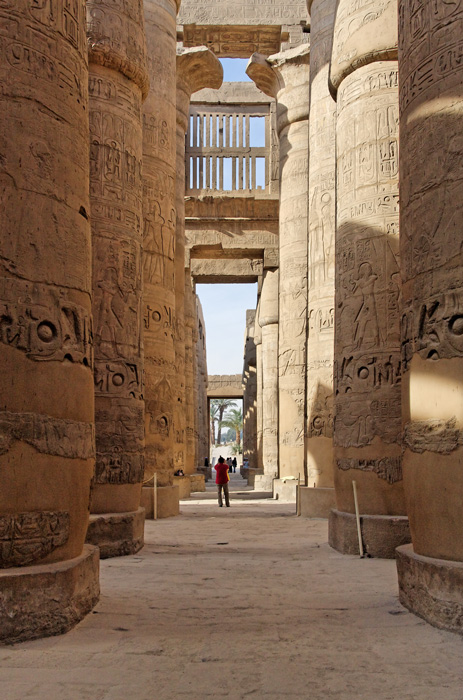 La vue ci-contre montre l'enfilade des colonnes dans l'axe nord-sud de la salle. Au premier plan, les colonnes latérales suivies par les colonnes centrales. Le but de cette partie n'est pas de décrire chaque colonne, ce qui est au-delà des possibilités actuelles de l'auteur, mais de donner un aperçu de la décoration de chaque type de colonne et de l'intérieur de la salle.