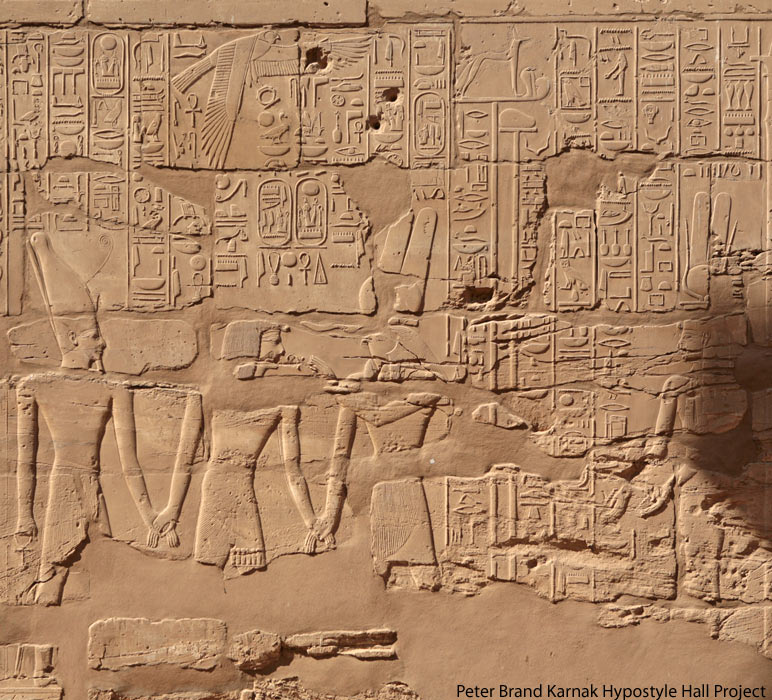 Scène 199 : le roi Sethy 1er est conduit vers le temple par Montou et Atoum. Devant, la déesse Hathor de Dendera le congratule. A l'avant, sur les deux pavois, Oupouaout, l'ouvreur des chemins et le placenta royal toujours représentés dans ce type de scène.