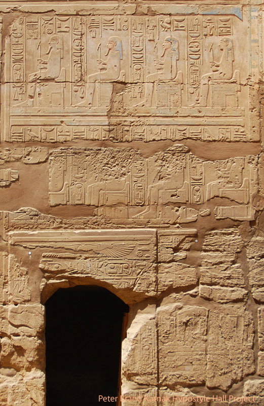 Scène 201  :  Des membres de la Grande Ennéade assistent au couronnement du roi dépeint dans la scène précédente. Des restes de peinture subsistent dans les zones à l'ombre.