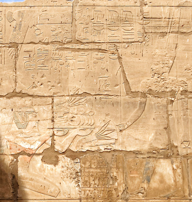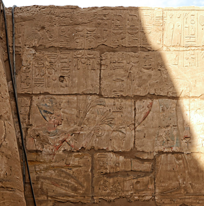 Scène 171 :  le roi Sethy 1er agenouillé offre des fleurs de lotus et de papyrus à Montou. Au dessus du roi, Behedet veille. Montou donne au roi la royauté et les années d'Atoum, etc..Protégée  par sa position dans le coin, cette scène a conservé encore des couleurs.