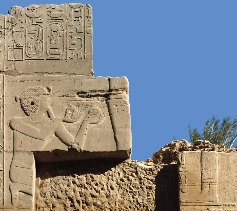 Scène 174:  le roi Sethy 1er agenouillé offre des bouquets de lotus et de papyrus à Amon-Rê qui lui donne toute la santé et toute la joie.
