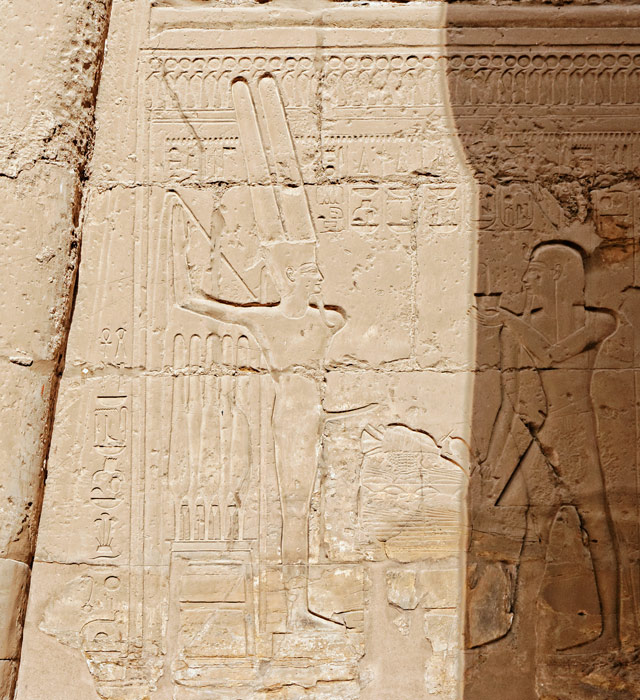 Scène 40 :  le roi  Ramsès II encense une offrande pour Amon-Rê Kamoutef ithyphallique. Derrière le dieu, la formule consacrée présente sur de nombreuses scènes.