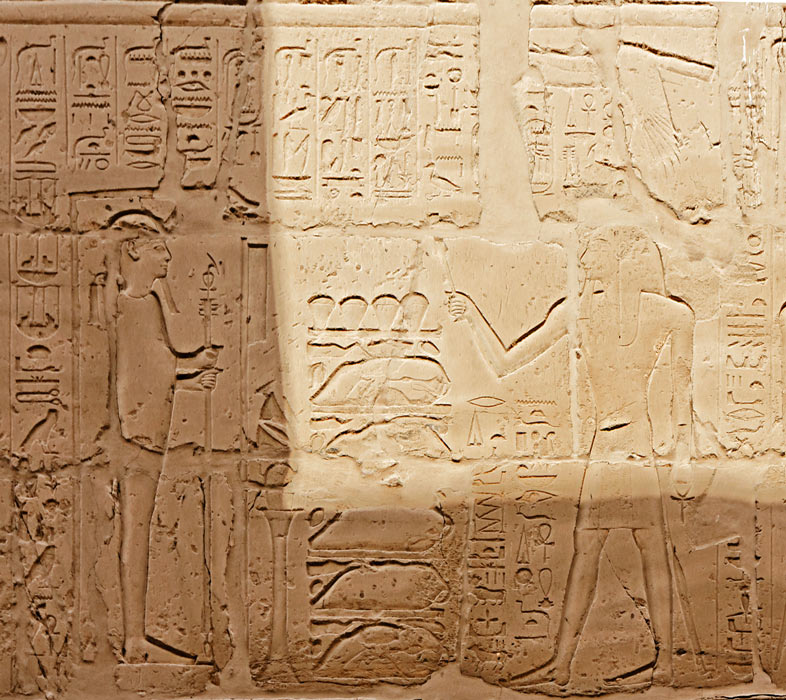 Scène 29  :  le roi se tient debout devant Amon-Rê et Mout, un fléau dans la main gauche. Le dieu lui promet toute vie, pouvoir, stabilité et santé. La déesse lui promet notamment qu'il célébrera autant de jubilés qu'Atoum.