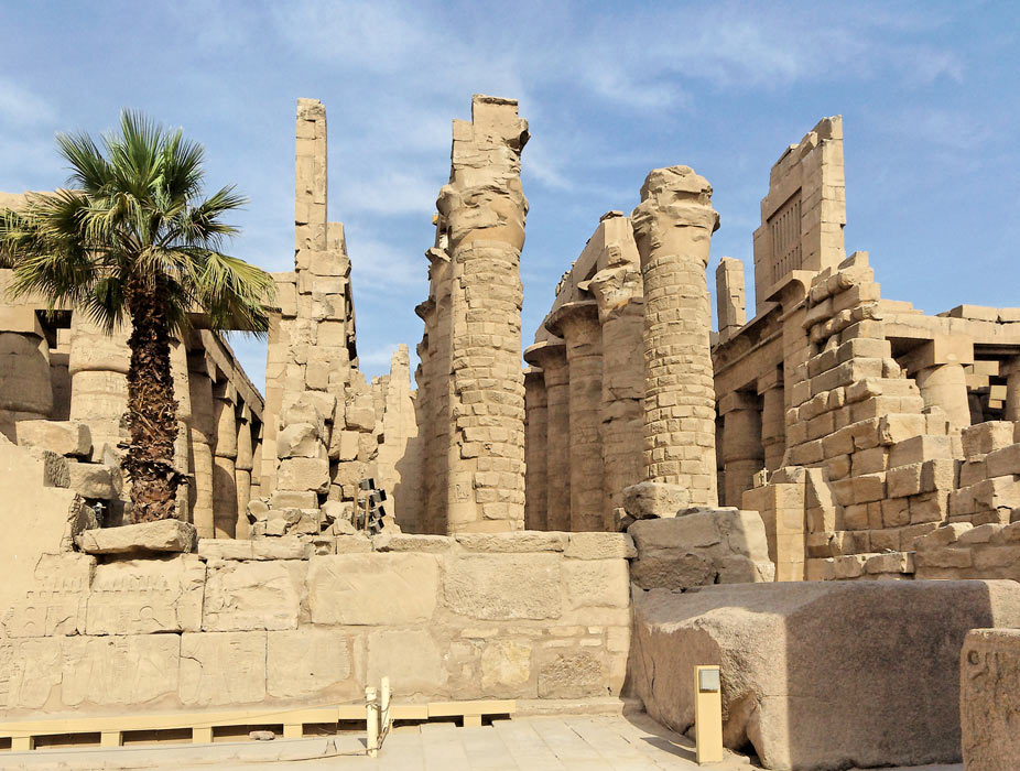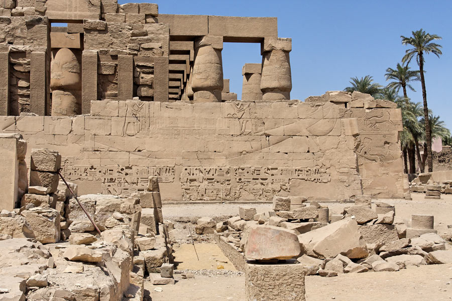 Cette vue montre la partie nord du IIIème pylône sur laquelle est gravée une scène montrant Amenhotep III sur la barque d'Amon. Lorsqu'il fut restauré dans les temps modernes, on trouva à l'intérieur les blocs de la Chapelle Blanche de Sésostris Ier et ceux de la Chapelle Rouge d'Hatchepsout. Ces chapelles sont reconstituées dans le Musée en plain air de Karnak. A droite, le retour du mur Nord avec 2 scènes des batailles de Sethy 1er.