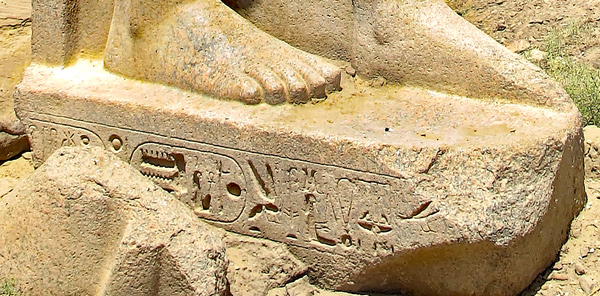 Sur le socle du colosse de droite, , est visible la titulature du roi Ramsès III : "...le roi de Haute et Basse Égypte, (Ouser Maât Rê, mery Imen)I" et en grande partie caché le nom de Fils de Rê. : "