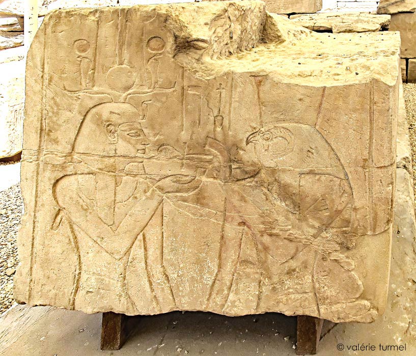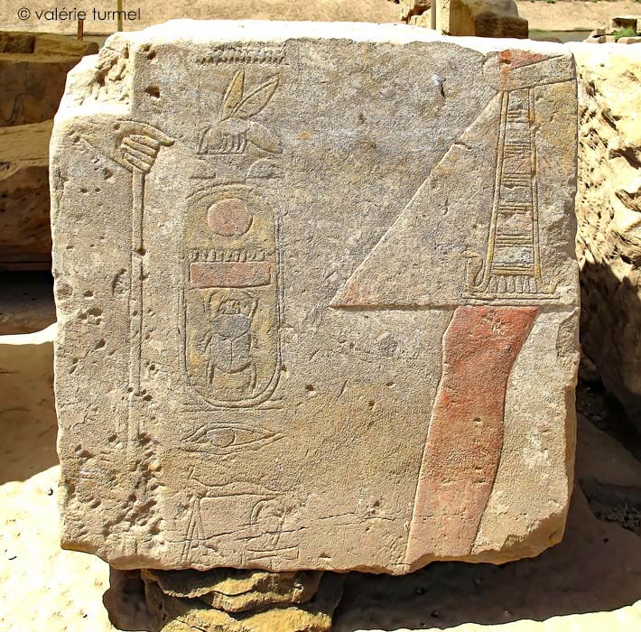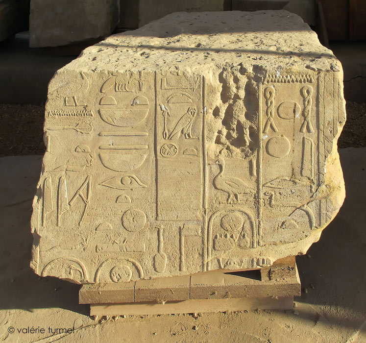 Le cartouche de Thoutmosis III :(Men Kheper Rê)I est incomplet sur ce bloc.