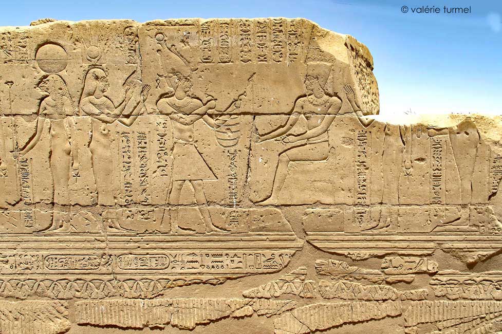 Le roi est couronné par Nekhbet du côté Sud et Ouadjet du côté Nord.
