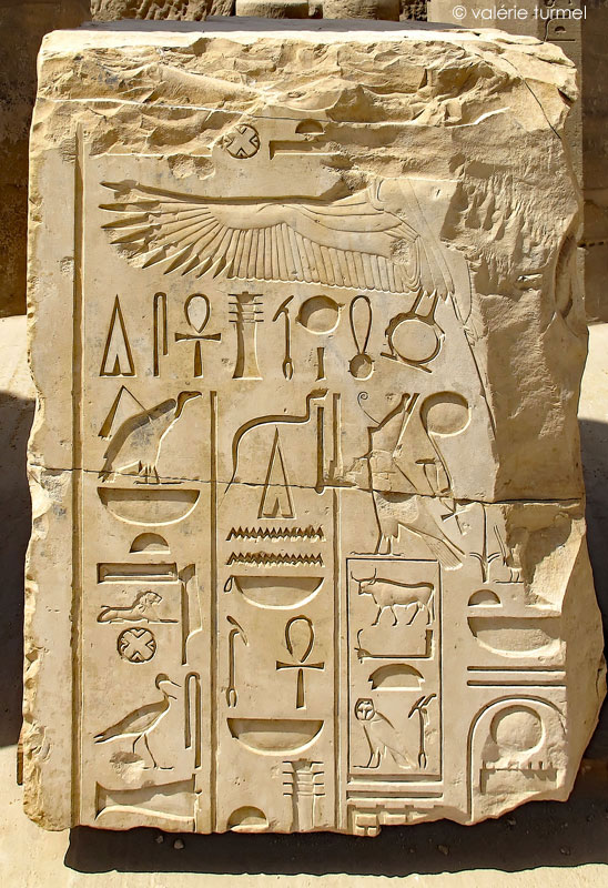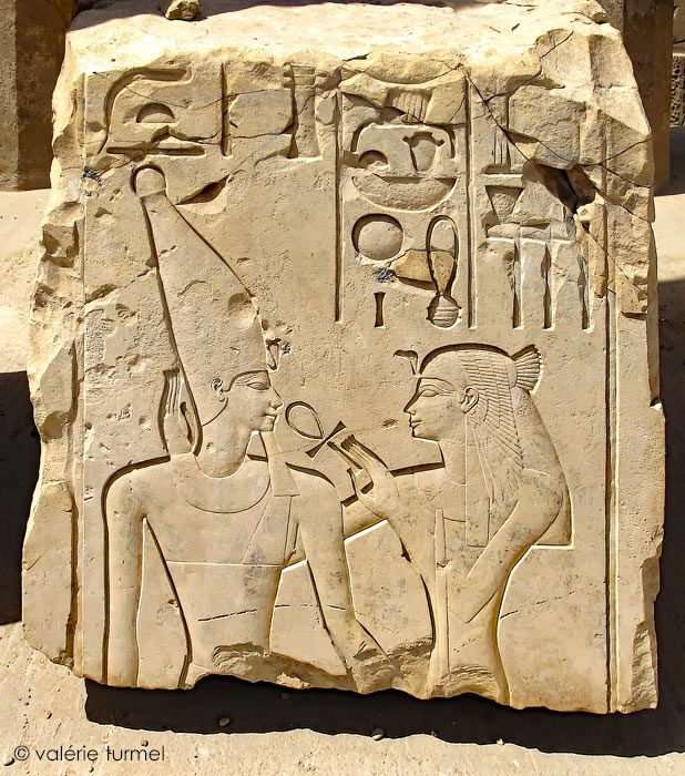 Sur le bloc de droite, en haut, [Behedety] le grand dieu donne la santé, la vie et la stabilité comme Rê. En dessous, à gauche, Mout, la maîtresse du ciel, ... donne au roi toute vie et puissance et toute stabilité (= durée).