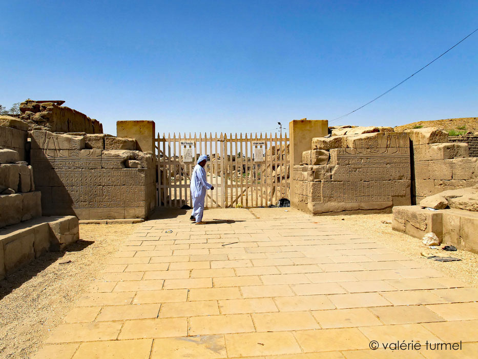 Les vestiges du propylône constituent aujourd'hui le point d'entrée de l'enceinte et du temple de Mout. Les décorations sont présentées dans les pages jointes. Sont présents les cartouches de Ptolémée II Philadelphe et Ptolémée III Évergète 1er