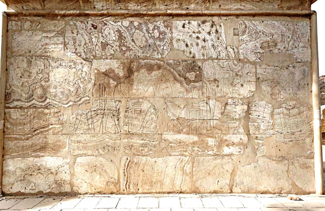 La nature du matériau utilisé , la calcite ou albâtre, et ses moirures rendent plus difficile la vision des scènes. Elles sont seulement gravées compte-tenu du matériau qui rend difficile le rendu en relief. Sur cette paroi de droite à gauche, le roi consacre des victimes suivi de son ka; ensuite course rituelle et consécration d'offrandes. Le nom du roi est celui d'Amenhotep 1er. |