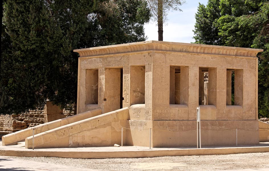 Certains piliers ont une face extèrieure qui est discutée dans la partie concernant les piliers. Dans les soubassements, sont présentés les nomes d' Egypte. Autour des portes, les titulatures de Sésostris (Senousret) 1er. Ces parties basses, ainsi que l'encadrement des portes, sont gravées en creux.
