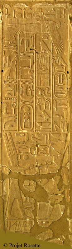 Le roi porte la couronne de Basse Égypte. Celui de Behedet plane au dessus de la scène. Derrière le dieu, une formule de protection : "Toute protection, vie, stabilité, santé avec lui".