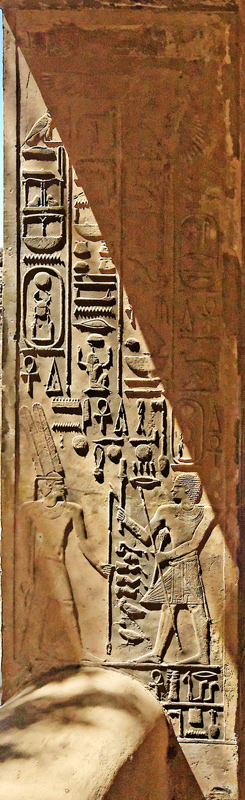 Le  roi présente le sceptre Sekhem à Amon-Rê ithyphallique. Il tient un long baton dans la main gauche.  Devant le roi, l'action à faire : 'Apporter 4 fois l'apport des cuisseaux et des volailles'. Le dieu lui donne des millions de fêtes-Sed.