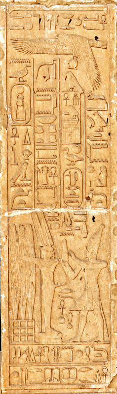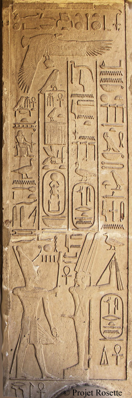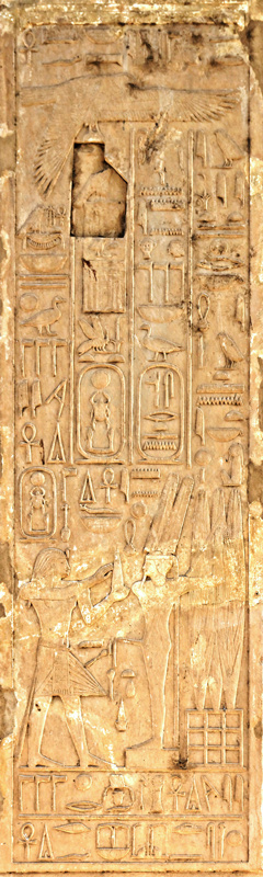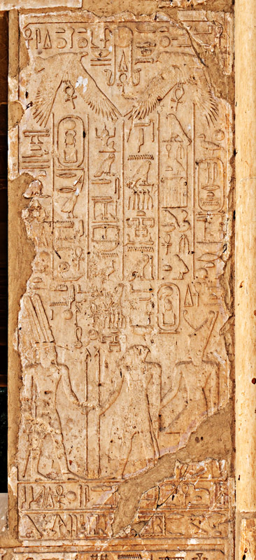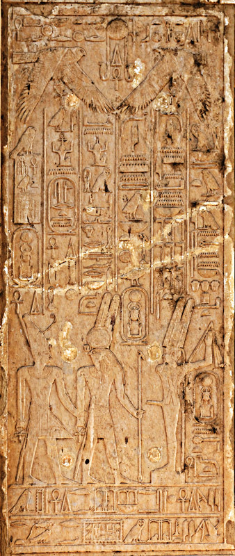Un vautour et un faucon veillent sur la scène : Nekhbet et l'Horus de Behedet. Entre les 2, un disque solaire avec 2 uaeri (cobras).