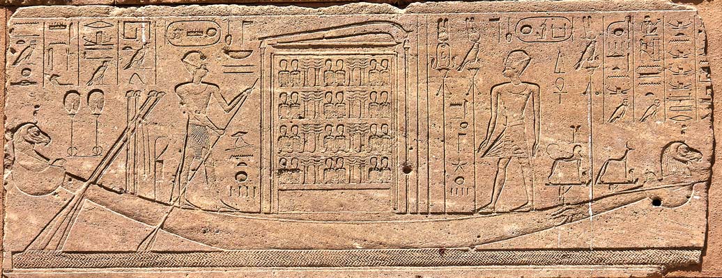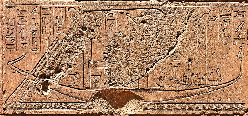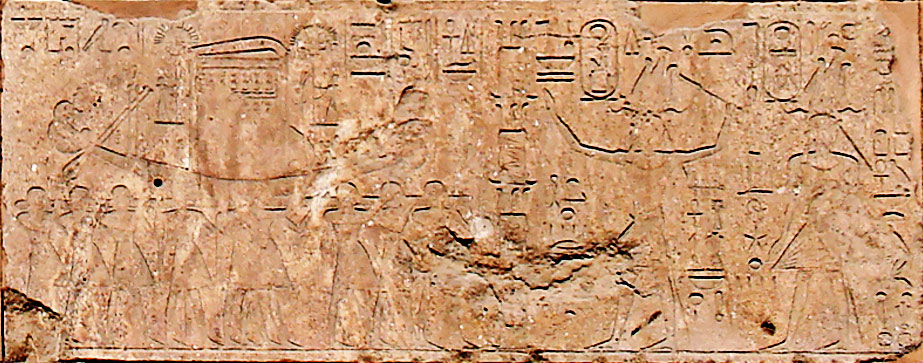 Thoutmosis III et Hatchepsout suivent sans doute la barque d'Amon dans une autre barque. Des petits signes Ankh ,Djed et Ouas portent des enseignes avec le placenta royal et Oupouaout.