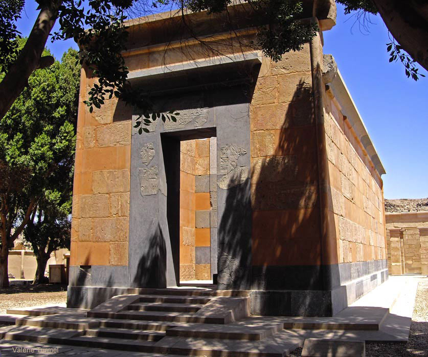 La décoration des façades Ouest et Est est indépendante de celle des longs côtés, sauf pour l'assise 1. L'assise du bas en diorite est constitué de deux parties : un soubassement en saillie de 9 cm, décoré de redans et un long défilé géographique au-dessus. Les scènes des assises 2 à 7 se répondent de chaque côté. Les assises 8 et 9 sont l'oeuvre de Thoutmosis III. La porte en diorite est également l'oeuvre de Thoutmosis III.