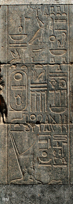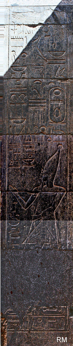 Thoutmosis III est coiffé de la couronne blanche au sud et de la couronne rouge au nord.. Un texte récapitule toutes les offrandes alimentaires présentées sur les parois. Les jambages ne sont pas formés de monolithes, mais de blocs superposés. |