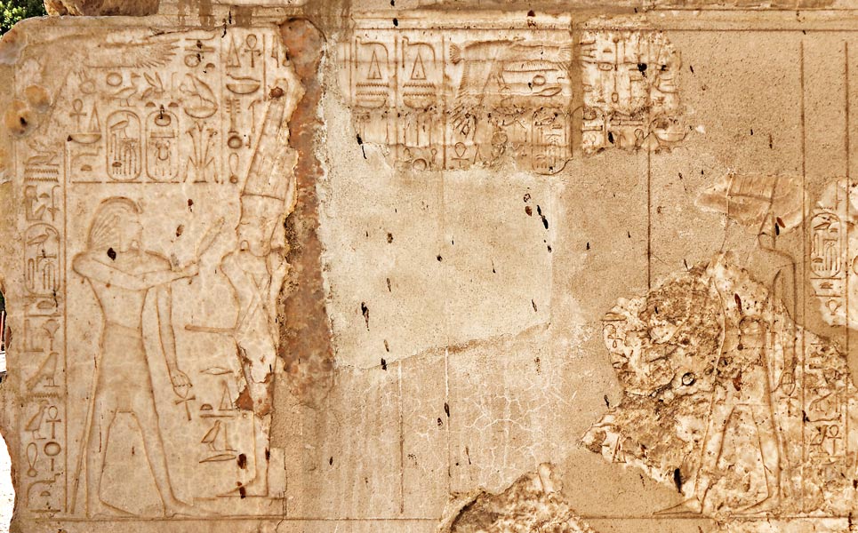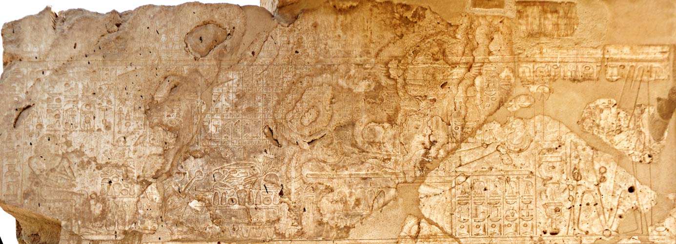 Plusieurs scènes se déroulent sur ce panneau du registre supérieur : à gauche, le roi est assis devant une table d'offrandes. Puis il est agenouillé offrant 2 vases et des victuailles posées sur une table à la barque d'Amon sur son piédestal. La liste des offrandes est gravée au-dessus de la barque. A droite, le roi est embrassé par Amon. Cette scène est identique à celle de la chapelle d'albâtre d'Amenhotep 1er placée sur la même paroi. |
