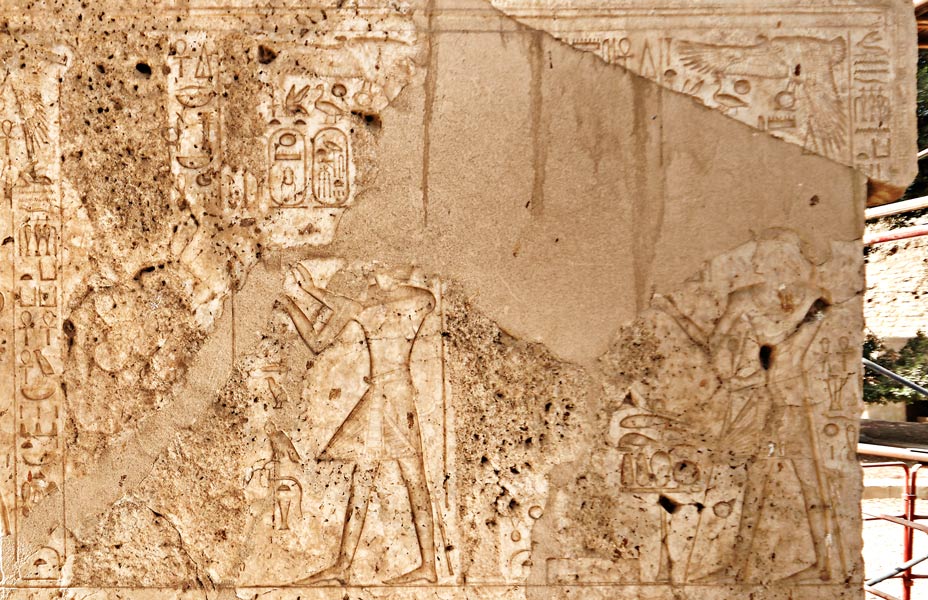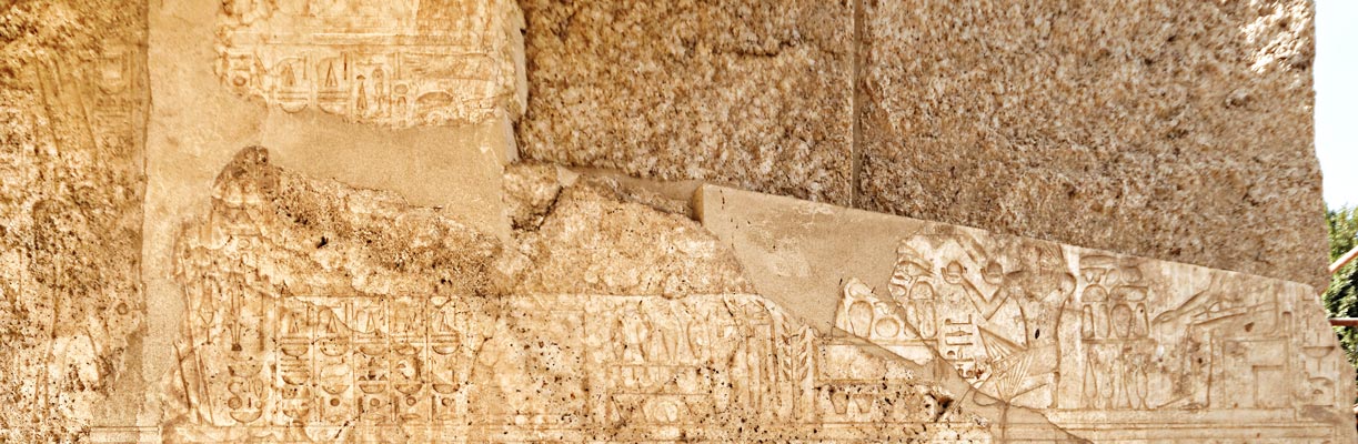Ces scènes très dégradées sont symétriques par rapport à celles du panneau intérieur nord. A droite, le roi est assis devant une table d'offrandes. Puis il est agenouillé offrant 2 vases et des victuailles posées sur une table à la barque d'Amon sur son piédestal. La liste des offrandes est gravée au-dessus de la barque. A gauche, le roi est embrassé par Amon. |
