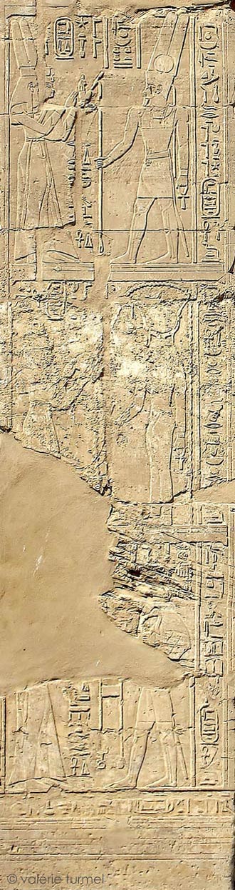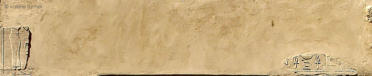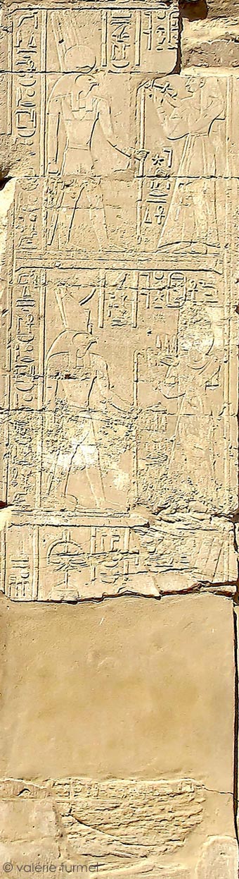 La divine adoratrice Chepenoupet I présente la campagne 4 fois au dieu Horus. Le dieu lui donne toute vie, toute santé et toute joie.