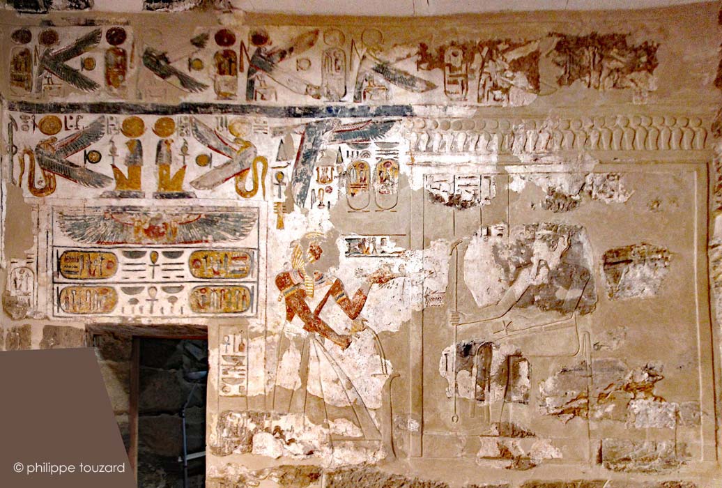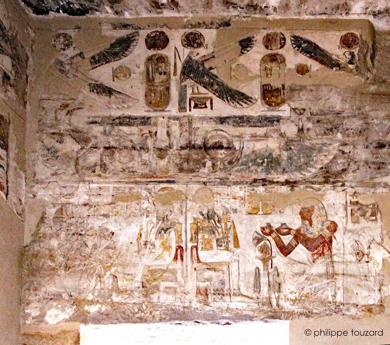 Au dessus de la porte de la chapelle XII, , au registre du haut, Nekhbet à gauche et Ouadjet  à droite protègent chacune une représentation de Khonsou.