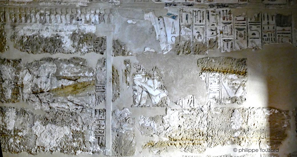 En dessous le disque ailé, les titulatures de Ramsès III: