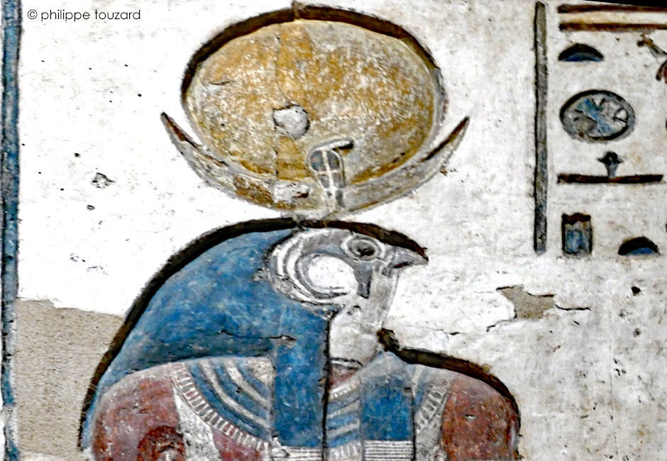 Khonsou, représenté en faucon portant le croissant et le disque lunaire est extrait de la scène Nord de la chapelle II. Cette chapelle est jointive de la chapelle I qui posséde 2 portes : une qui ouvre sur le sanctuaire et l'autre sur la salle hypostyle. La chapelle III est du côté Ouest du sanctuaire, comme les chapelles I et II.