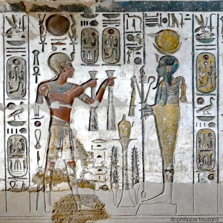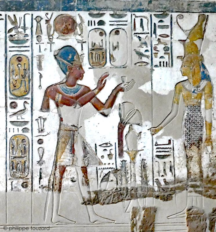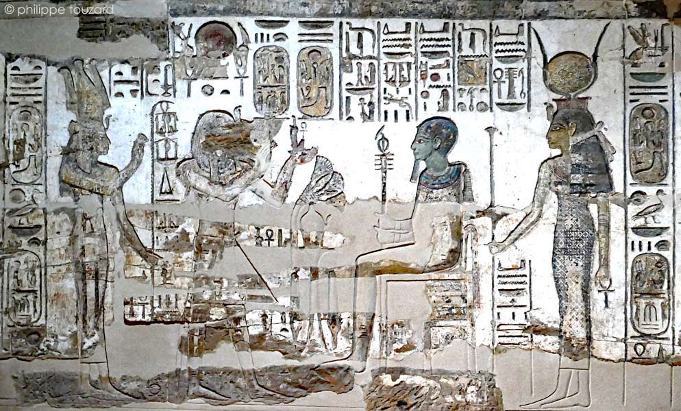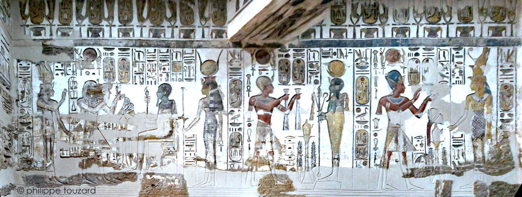 La scène du côté gauche ici (côté porte) avec Nekhbet fait face à la scène Est avec Oudjet.