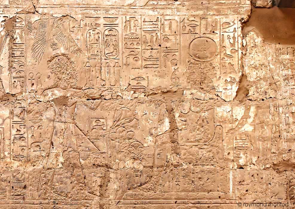 Ramsès XI accomplit l'offrande de l'onguent-medjet à Khonsou en présence de la Maât. Khonsou de Thèbes, Neferhotep,le grand dieu  lui donne la royauté d'Atoum. Maât, la fille de Rê, qui réside dans Thèbes, la maîtresse du ciel, donne au roi toute vie, toute puissance et toute santé. Nekhbet protège le roi.