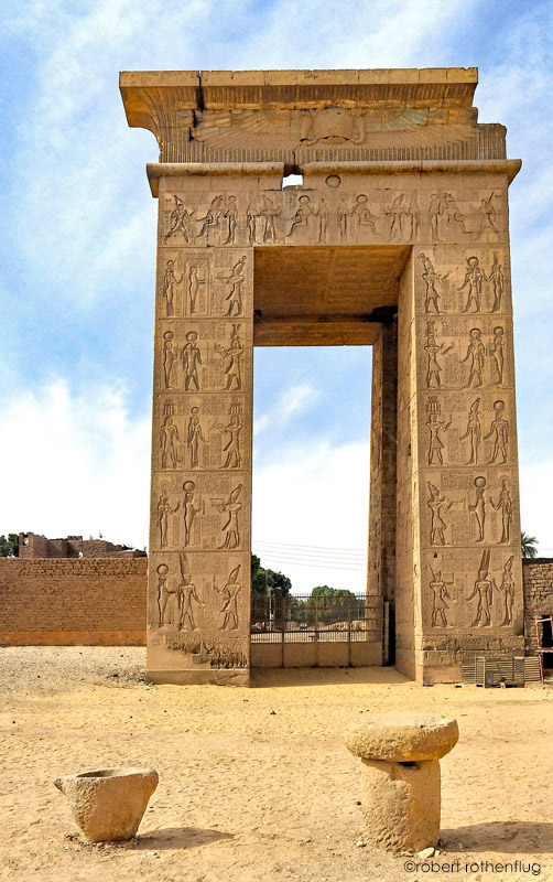 Les faces Nord et Sud, ainsi que l'intérieur, sont couverts de scènes d'offrandes et de décorations, toutes datées du règne de Ptolémée Évergète I (le bienfaiteur). Son iconographie est largement dédiée au dieu Khonsou, ce qui la relie étroitement à son temple.