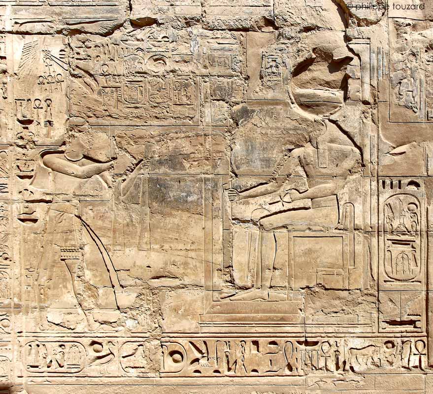 Dans une scène symétrique du côté est, le roi Ramsès IV offre des fleurs à Khonsou.