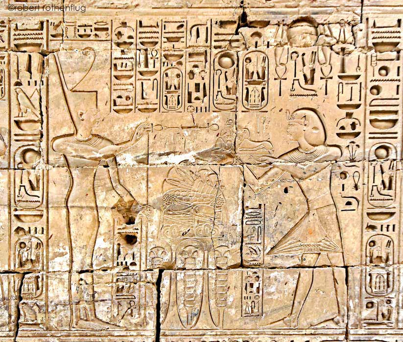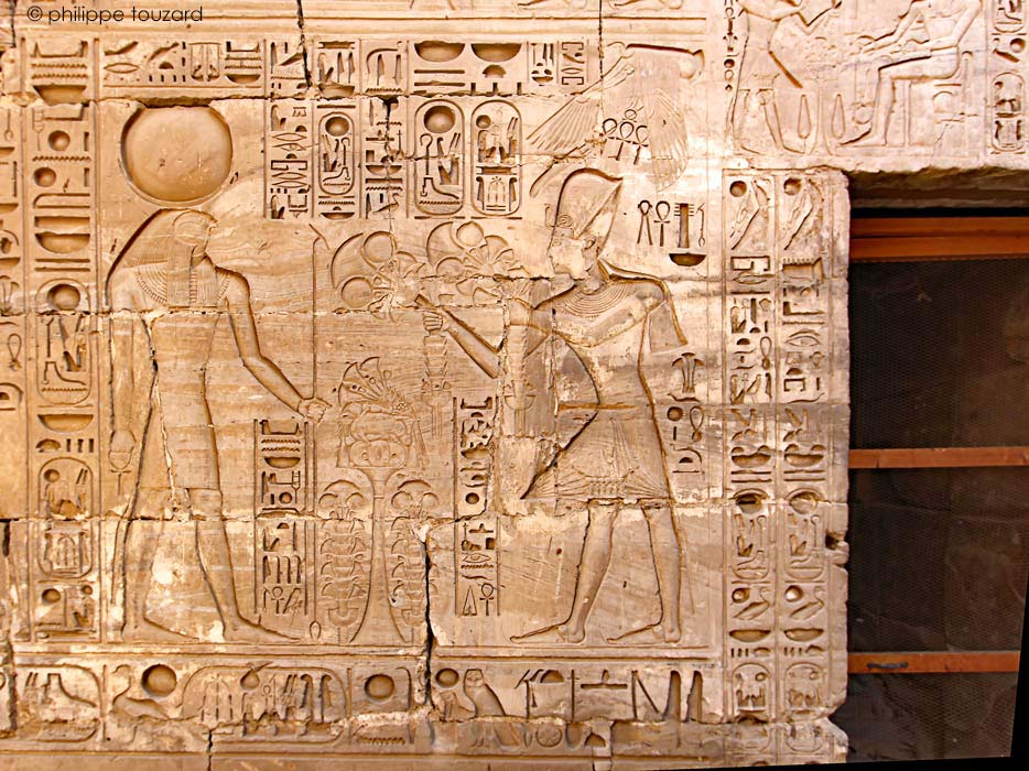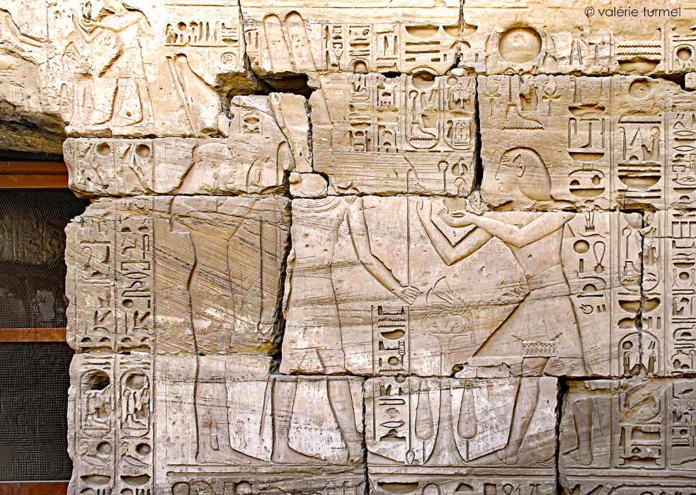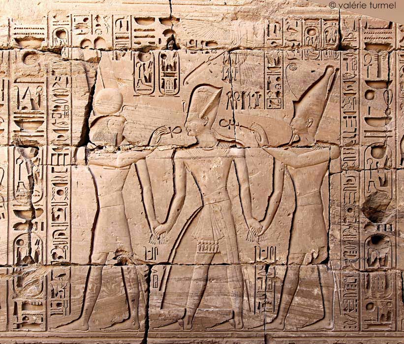 Ramsès IV fait l'offrande de son nom (Heka Maât Rê)I à Amon-Rê et Mout.