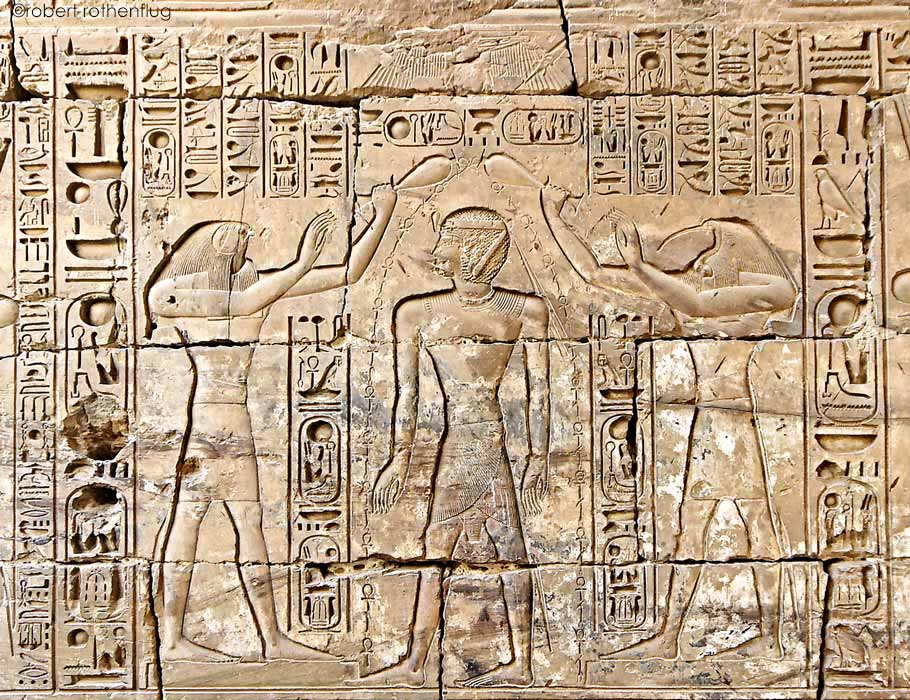 Horus et Thot, ici dieux "outils", purifient le roi avant son introduction auprès des dieux.