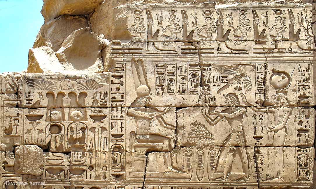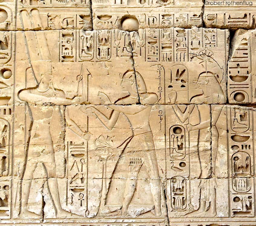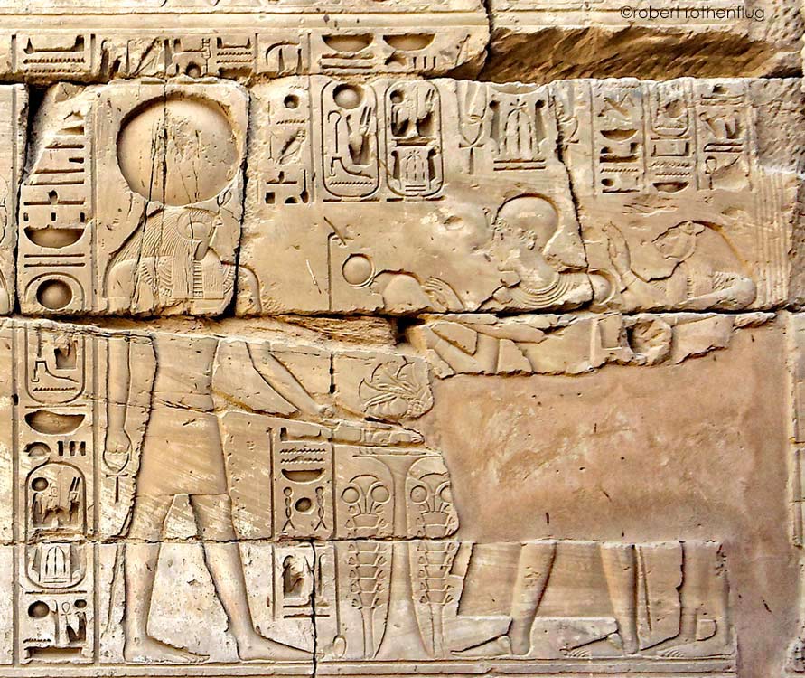 Ramsès IV est accompagné d'Isis, la grande, maîtresse du ciel, qui fait le geste de protection. . Le roi fait l'offrande de son nom  à Klonsou Neferhotep qui lui donne toute vie, stabilité (durée) et puissance comme Rê. Le sceptre Héka, la Maât et le disque solaire Rê expriment le nom : (Heka Maât Rê)I  "Le souverain de la Maât de Rê".