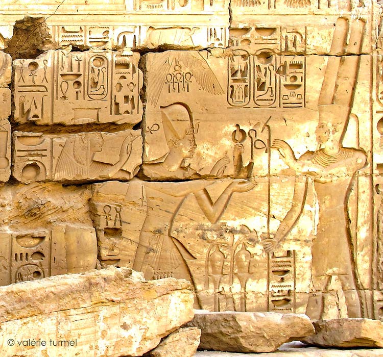 Ramsès IV fumigène de l'encens et verse une libation devant Khonsou dans Thèbes, Neferhotep. Le roi est accompagné d'Ouadjet, représentée avec une tête de lionne.