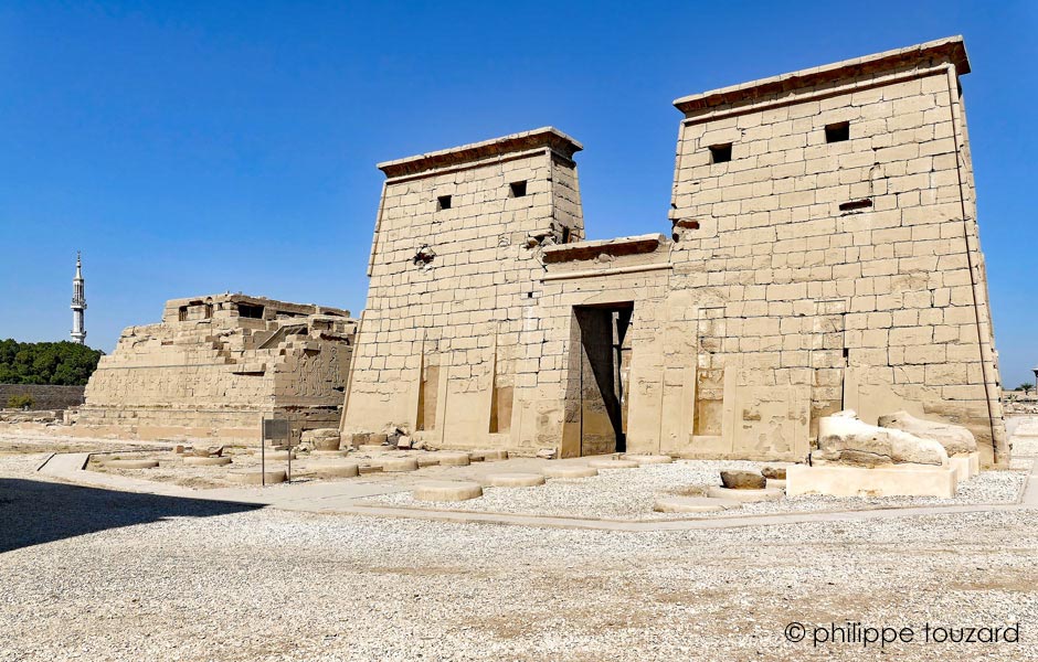 Le temple proprement dit comporte un ptlône, une grande cour pértstyle avec un portique, une salle hypostyle, le sanctuaire de la barque et une salle avec un reposoir de barque. Des chapelles entourent ces deux dernières salles.
