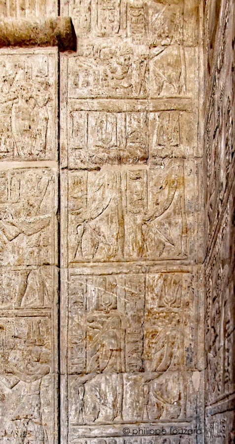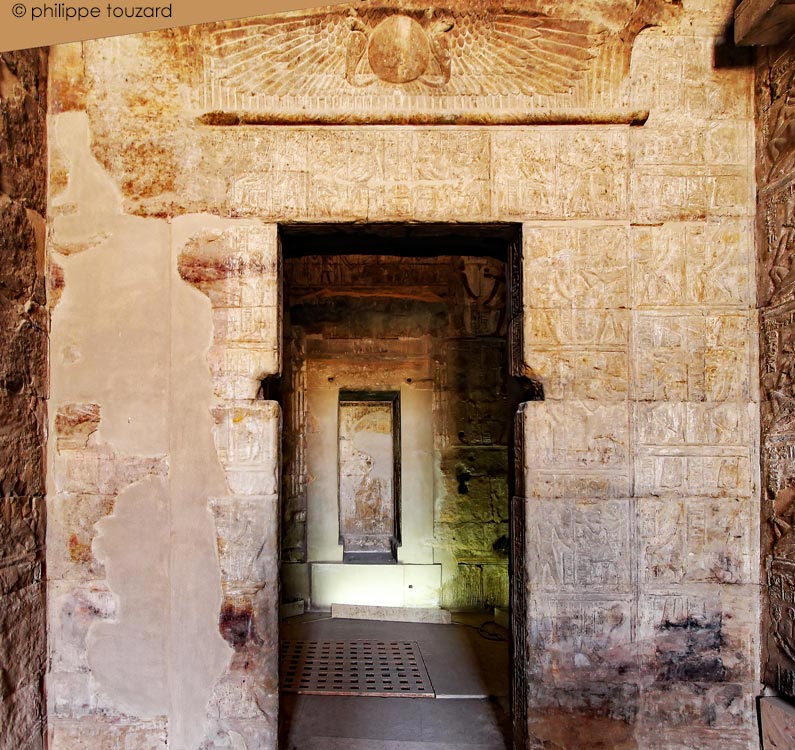 À travers la porte du sanctuaire, s'aperçoit la silhouette de la d"esse Opet dans sa niche. Le linteau comporte 4 scènes et chaque montant possède 4 registres de scènes d'offrandes. Les scènes de droite à côté de la porte représentent les déesses des mois sur 5 registres.