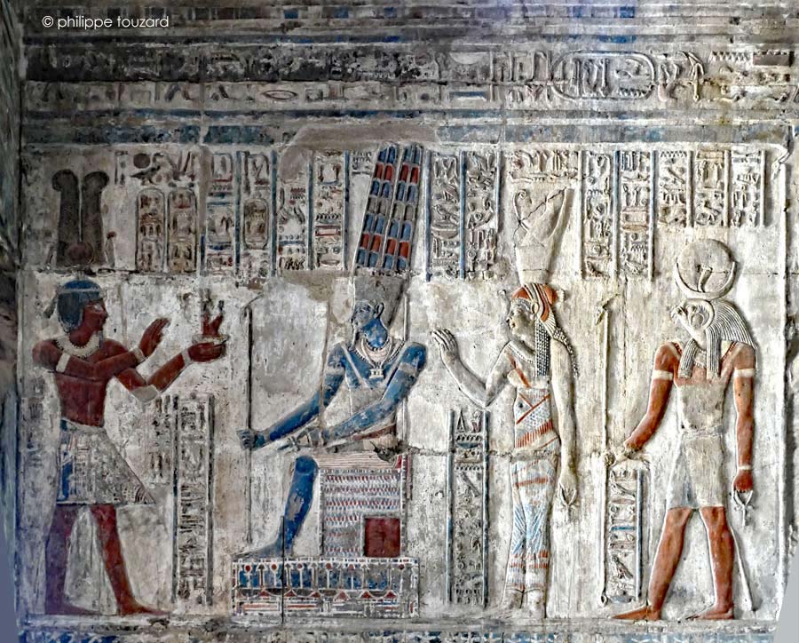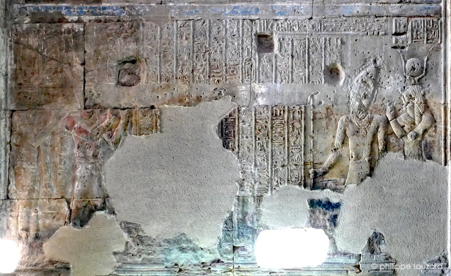 L'e roi Ptalémée Évergète II accompagné par la reine Cléopatre II adore Osiris (Ounenefer juste-de-voix)I  et Ipet-Ouret qui met au monde les dieux.(Opet 80)