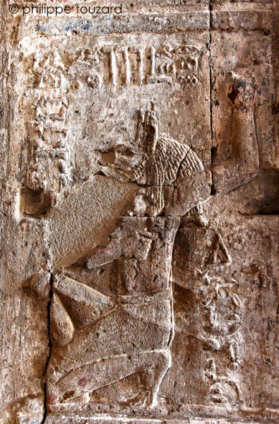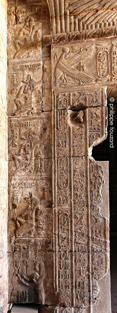 Au dessus de la porte, en haut à droite, le Vent du Sud est figuré par un bélier à 4 ailes. C'est le vent de l'inondation qui va produire les bonnes choses à mettre sur les autels à l'intention d'Osiris.