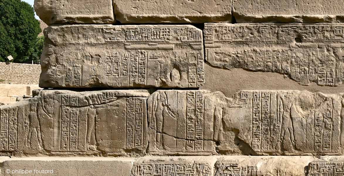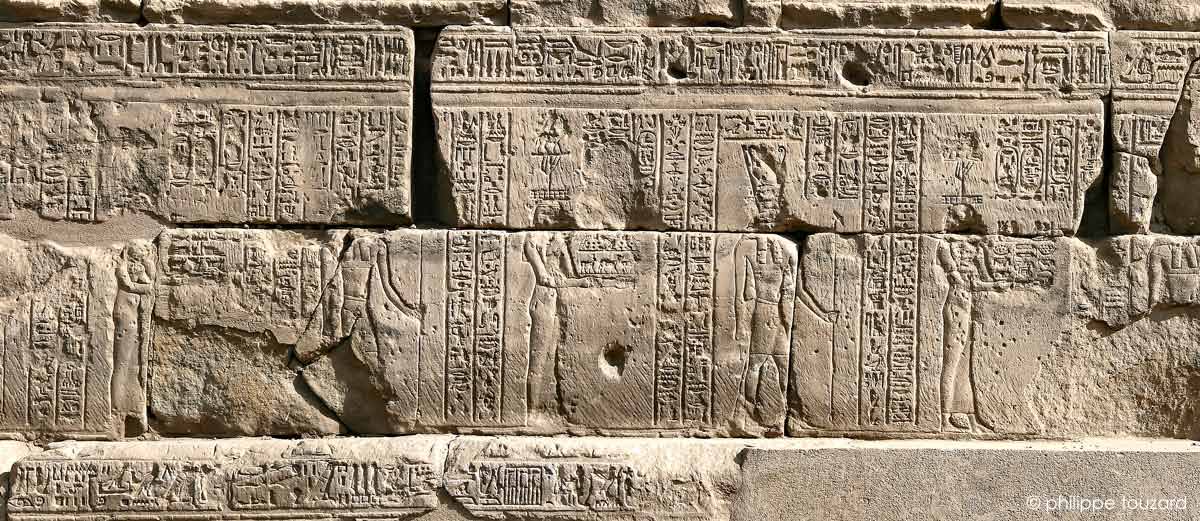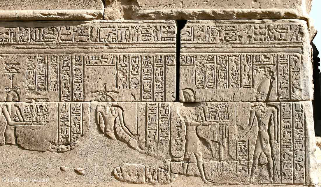 Chargé d'offrandes, l'empereur  Auguste précède un défilé des provinces (nomes) de Haute Égypte et de leurs divinités associées qu'il amène devant le dieu Osiris Ounennefer (éternellement beau) juste de voix (écrit dans un cartouche). Osiris, roi des dieux, éclaire Thèbes de ses rayons solaires.