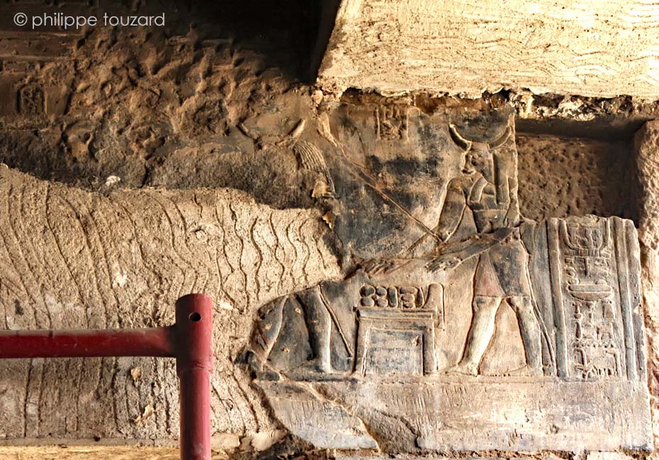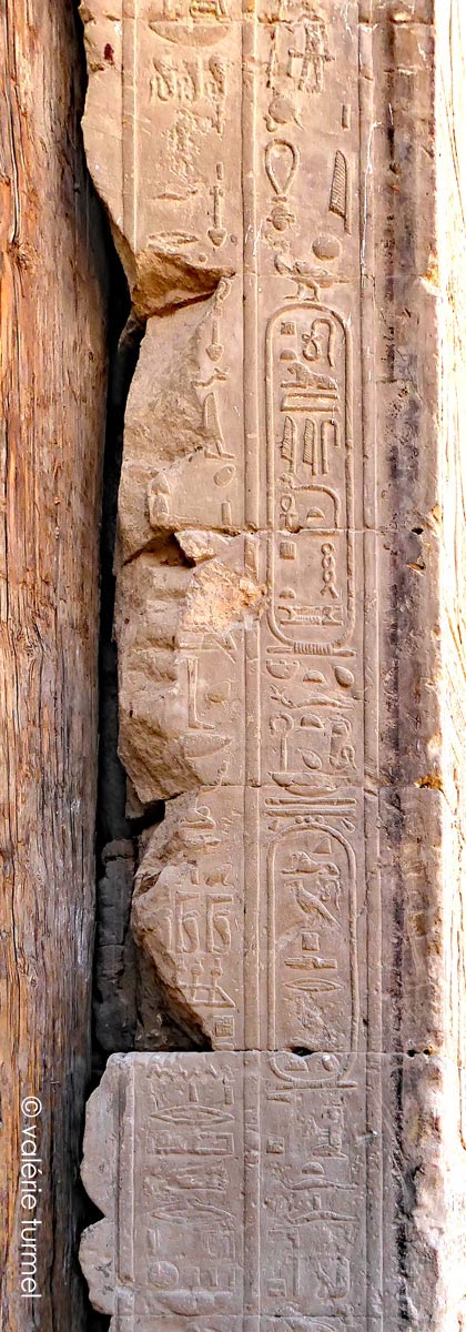 Sur l'embrasure Sud, les cartouches donnent les noms du roi Ptolémée Évergète II "Qu'il vive éternellement Aimé de Ptah".et de la reinz Cléopatre II.