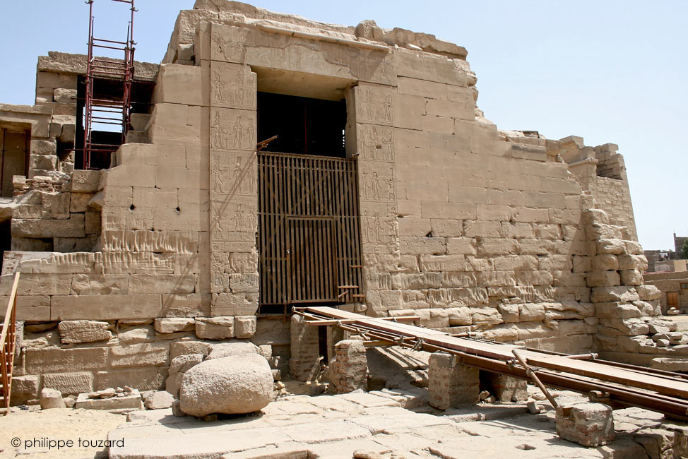 L'intérieur de l'hypostyle, comme l'intérieur du temple est daté de Ptolémée VII Évergéte II (170-163 et 145-116 av. J.C.). les scènes de l'extérieur de la porte ont été réalisées un peu plus tard, par Ptolémée XII Neos Dionysos (80-58 et 55-51 av. J.C.).