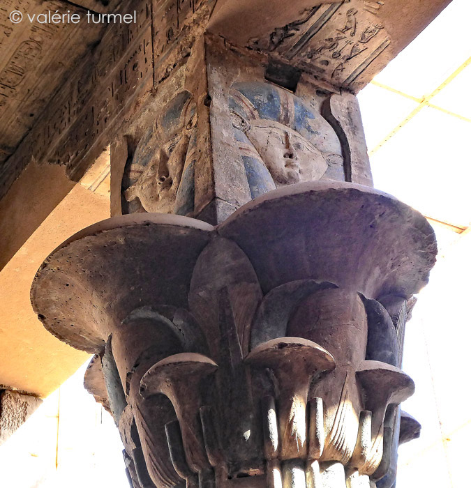L'empereur Le chapiteau de la colonne Nord est quadrilobé sur sa partie supérieure, et comporte 8 lobes sur la partie inférieure. Entre les deux, des représentations de feuilles. Sur l'abaque, Hathor à oreilles de vache est sculptée dans le creux sur les 4 côtés.