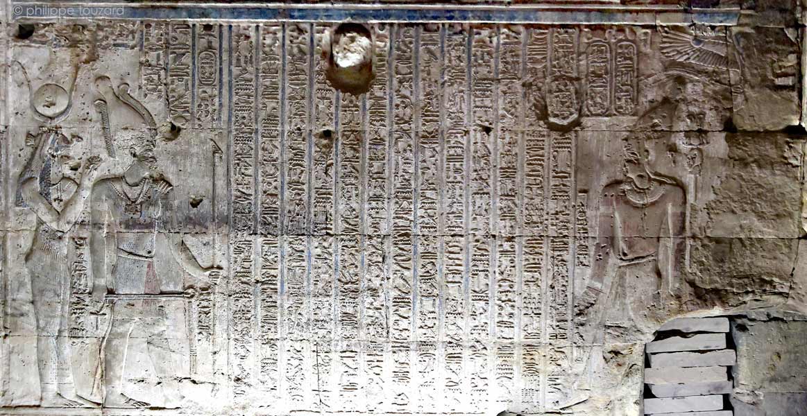 Le roi Ptolémée Évergète II accompagné de la reine Cléopatre II présente le Maât à Amon-Rê qui est dans Karnak, grand dieu du ciel et de la terre et Mout, la grande, maîtresse d'Ichèrou, maîtresse du ciel. Behedety, le grand dieu, maître du ciel, veille sur la scèn. (Opet 122)e.