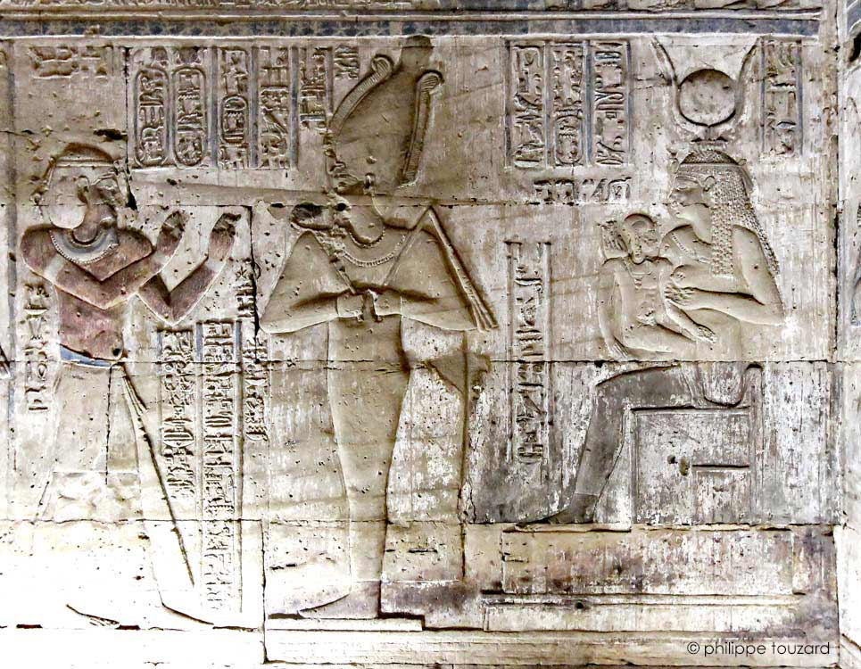 Le roi Ptolémée Évergète II  adore les divinités Osiris et Isis qui allaite Horus. Osiris (Ounenefer juste-de-voix)I roi des dieux annonce au roi que le monde entier est en adoration devant lui. Isis la grande porte les titres de mère du dieu, œil de Rê, maîtresse du ciel, épouse du dieu Osiris. La déesse allaite Horus, le premier roi sur le trône d'Égypte. Horys, fils d'Osiris est représenté comme un enfant anthropomorphe.
